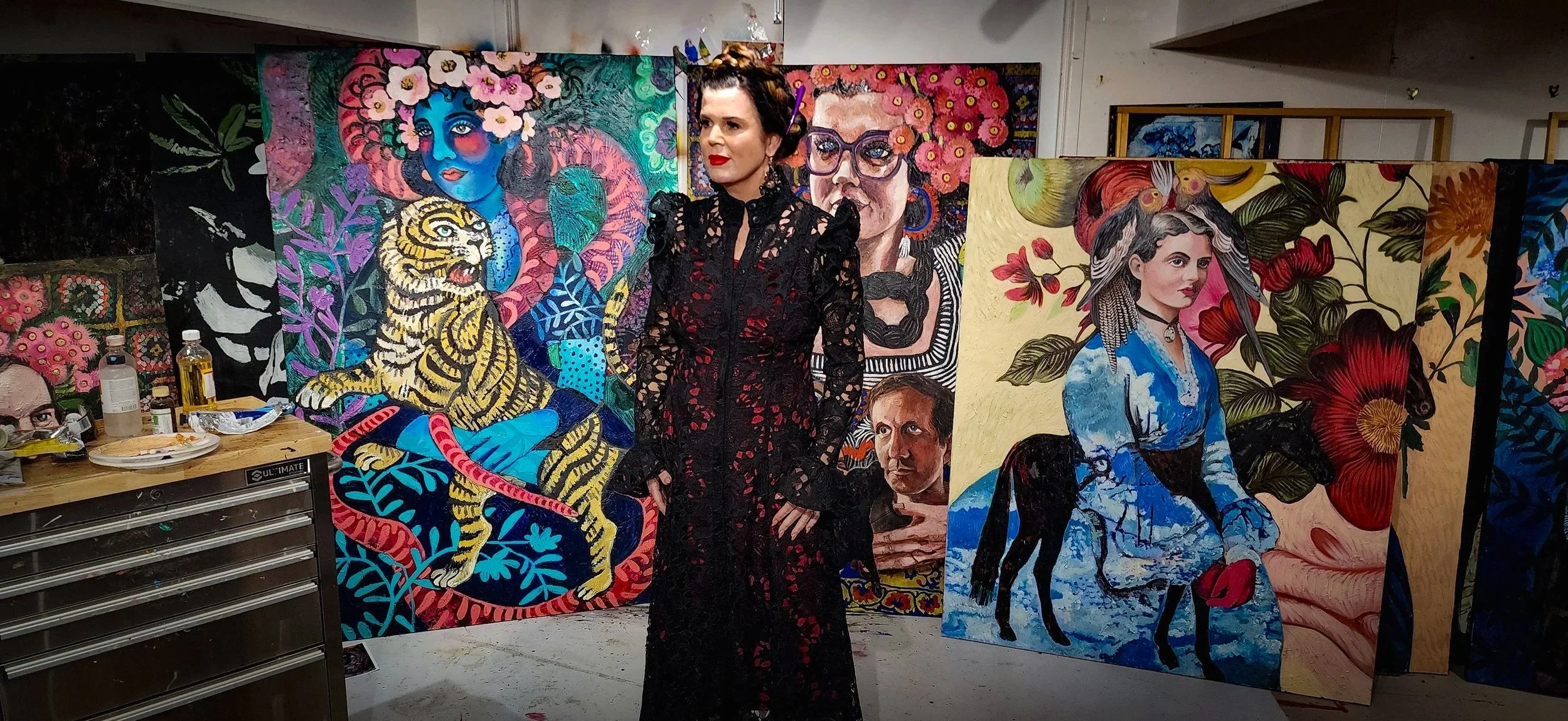 Working in large-scale figurative painting, constructed through the intimacy of collage, she explores archetypes, dreamscapes, and dualities through layered colour, pattern, and spiritual iconography. A graduate of the Queensland College of Art, Hickey has presented ten solo exhibitions and participated in over thirty group shows and has been recognised in major national prizes including The Doug Moran, The Lester, and The Percival Portrait Prize.